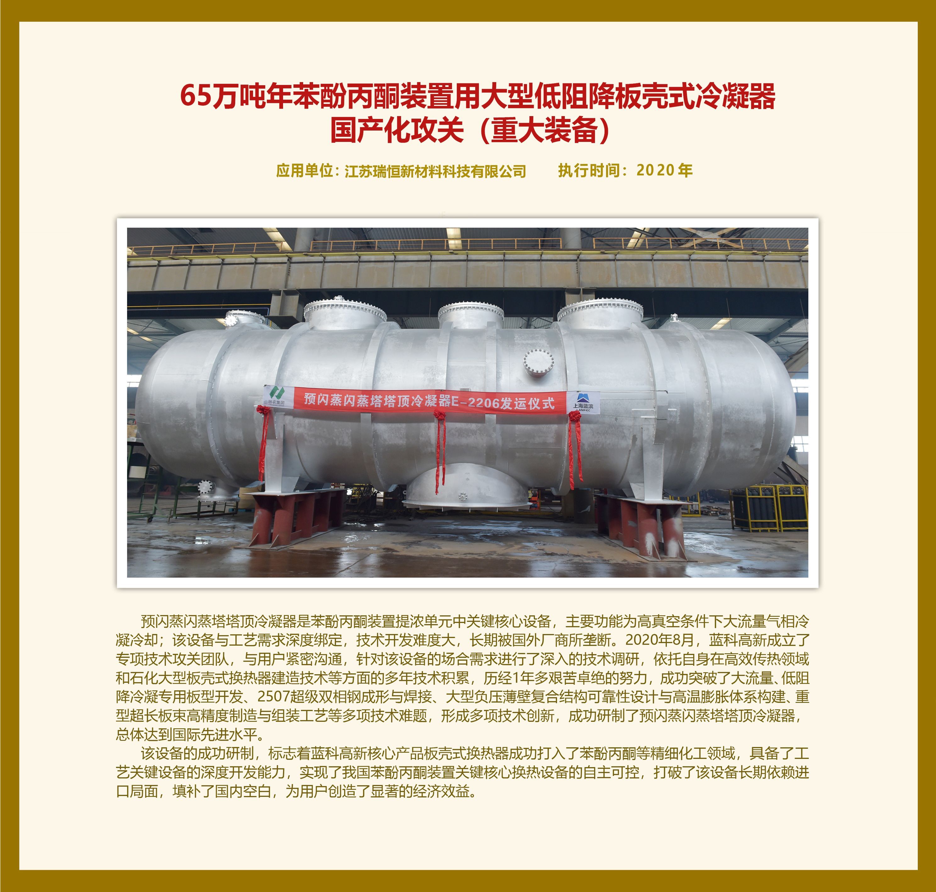 65萬噸年苯酚丙酮裝置用大型低阻降板殼式冷凝器 國產化攻關(重大裝備)