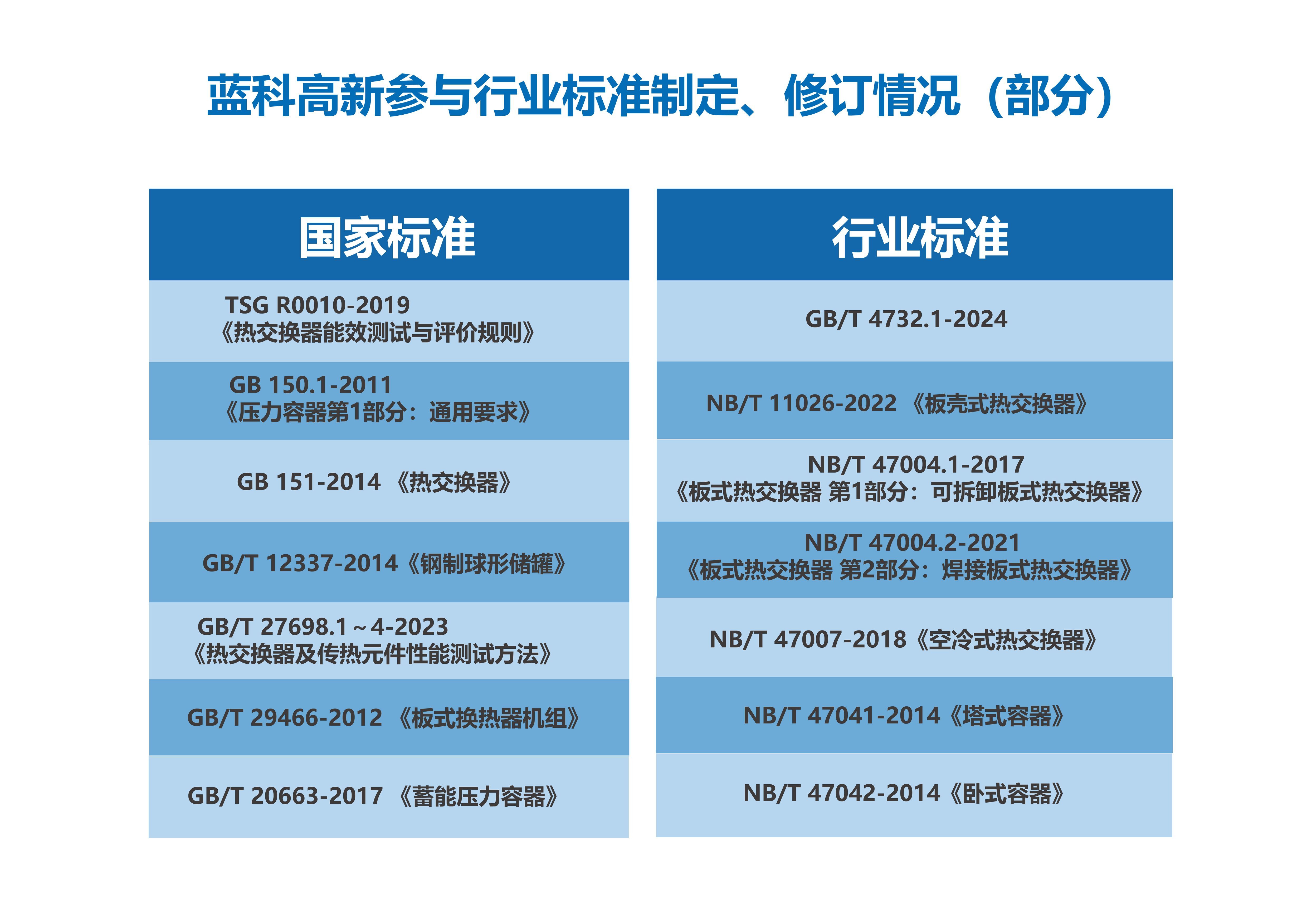 ???藍(lán)科高新是全國(guó)鍋爐壓力容器標(biāo)準(zhǔn)化技術(shù)委員會(huì)熱交換器分技術(shù)委員會(huì)、移動(dòng)式壓力容器分技術(shù)委會(huì)和低溫容器分技術(shù)委會(huì)依托單位;是中國(guó)石油和石油化工設(shè)備工業(yè)協(xié)會(huì)石油鉆采機(jī)械專(zhuān)業(yè)委員會(huì)等9個(gè)委員會(huì)的主任委員、副主任委員或秘書(shū)長(zhǎng)單位,同時(shí)還參加其他28個(gè)行業(yè)技術(shù)協(xié)會(huì)(學(xué)會(huì))。主辦行業(yè)核心期刊《石油礦場(chǎng)機(jī)械》《石油化工設(shè)備》;承擔(dān)相關(guān)行業(yè)標(biāo)準(zhǔn)制修訂與宣貫,產(chǎn)品安全注冊(cè)與評(píng)審等多項(xiàng)工作,共制修訂國(guó)家標(biāo)準(zhǔn)、行業(yè)標(biāo)準(zhǔn)及地方標(biāo)準(zhǔn)80余類(lèi),430余項(xiàng)。
